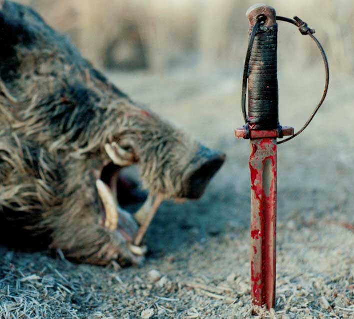 1. @Paulo Di Fiori It was an old WWII (I think) military bayonet that I fashioned into a pig hunting knife. Old school setup, I wrapped sodden cow hide leather thonging around the handle where it dried to form a secure grip.